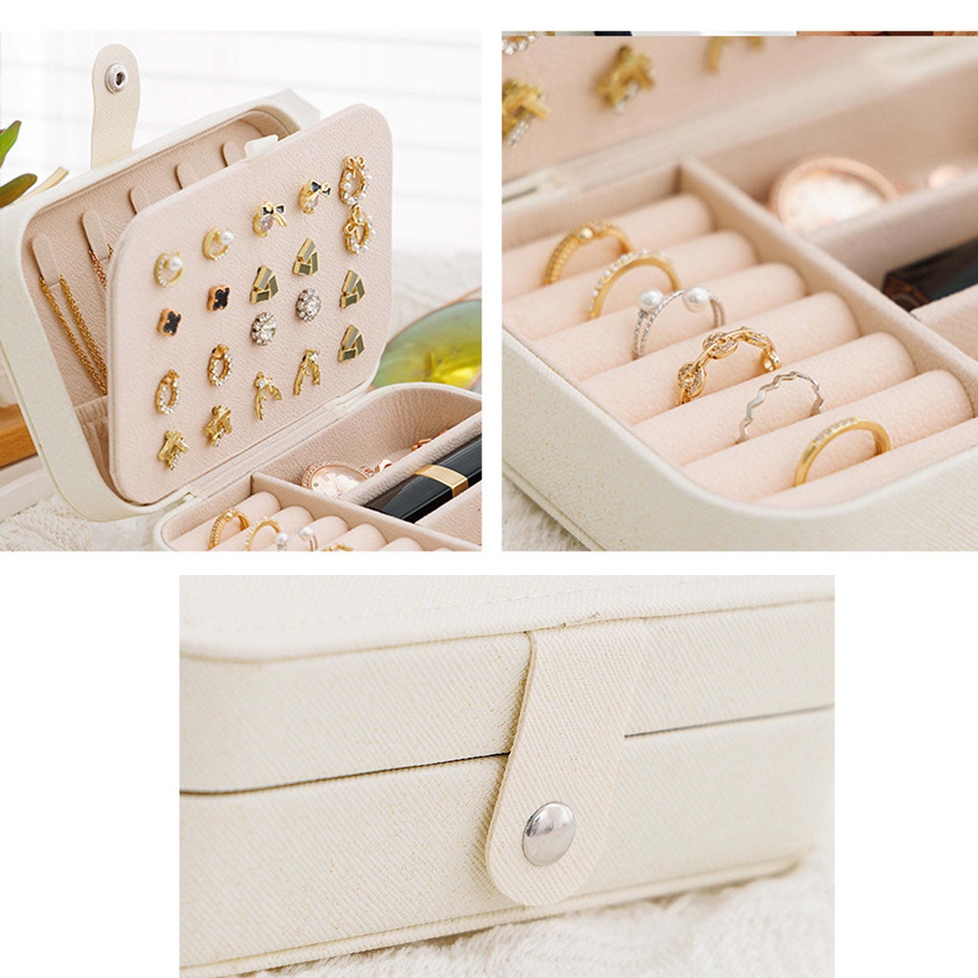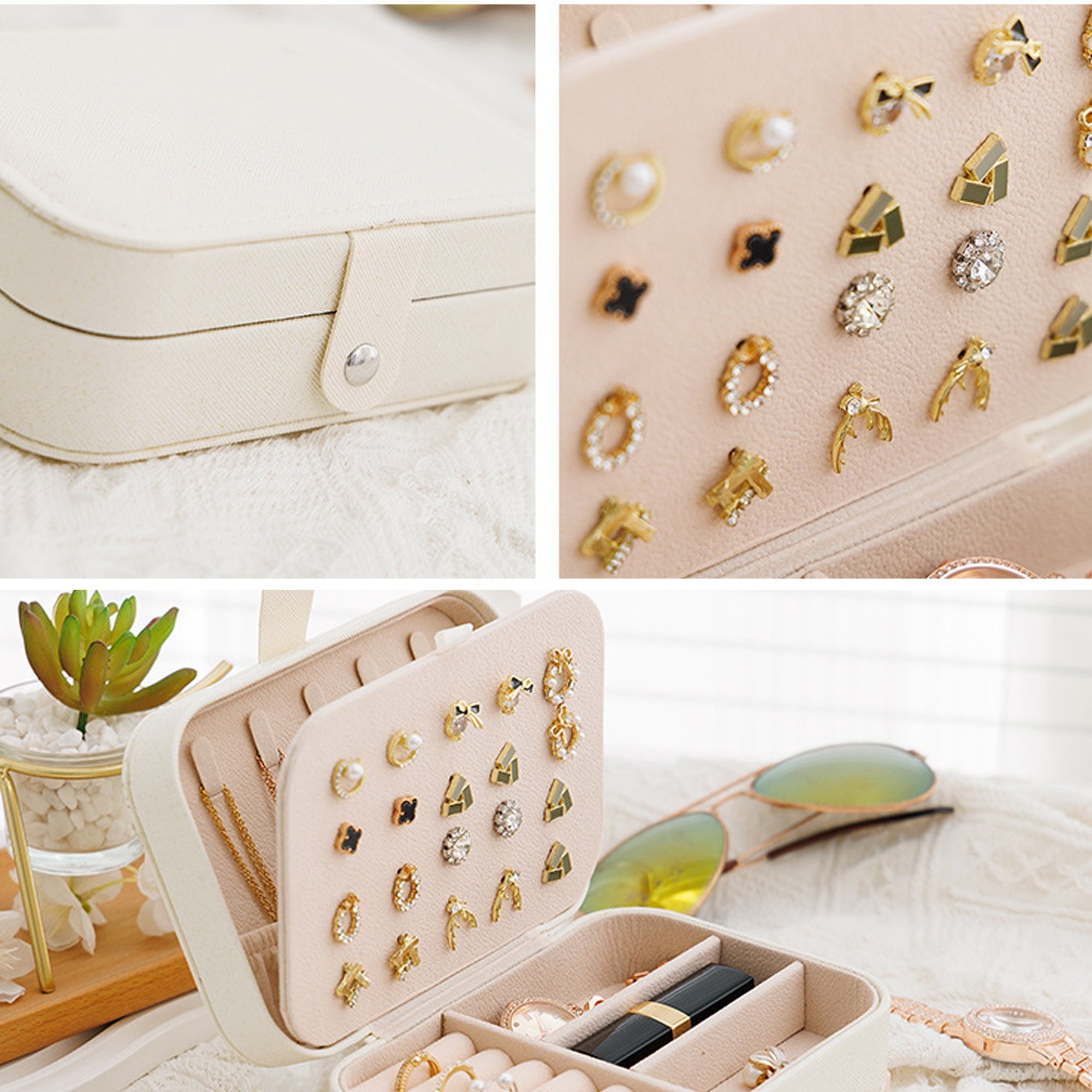 MULTIFUNCTIONAL STORAGE: Maximizes every inch of space with an intelligent layout featuring a 20-hole earring stud plate, multiple ring rolls, and spacious bottom compartments that easily accommodate bulky items like watches, large hoops, or lipstick.